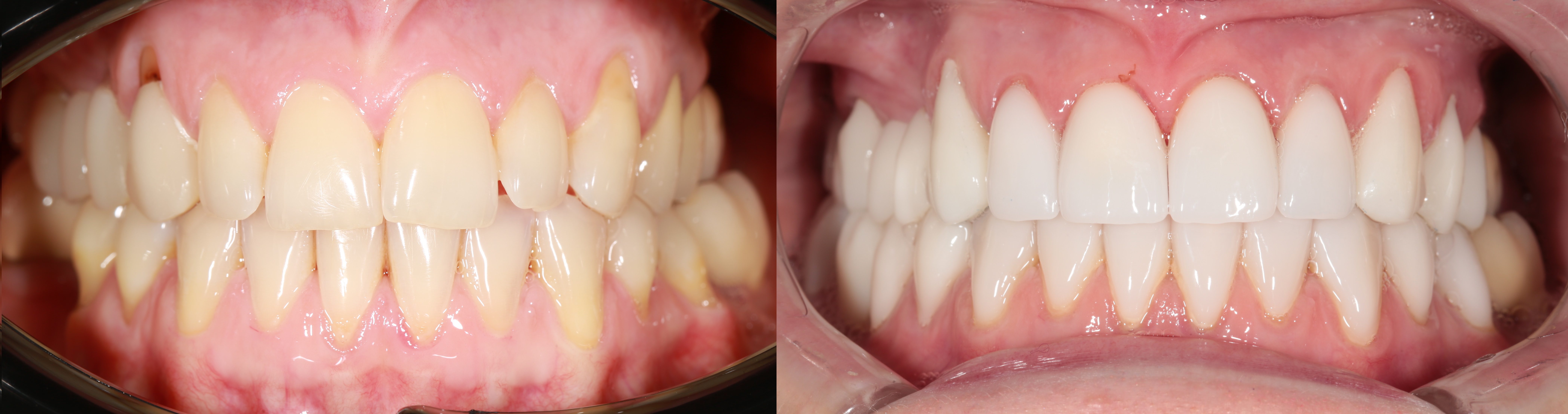 Установлены коронки из оксида циркония с опорой на импланты и керамические виниры на нижних фронтальных зубах.
