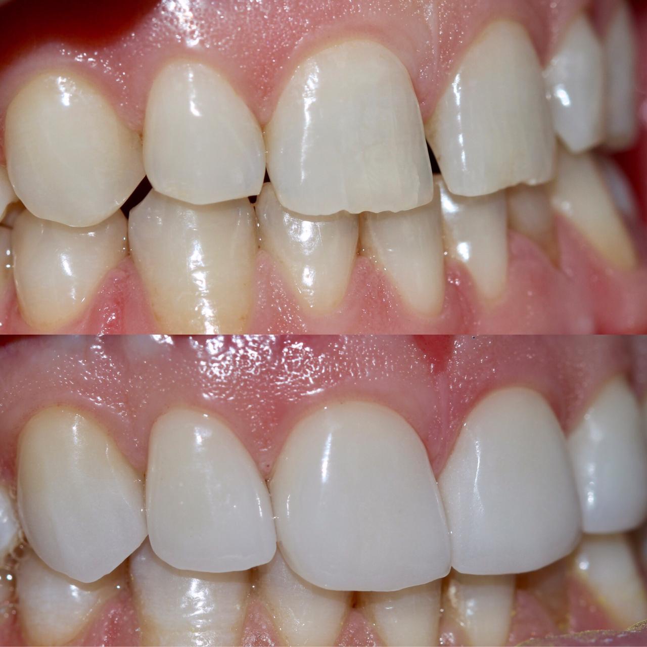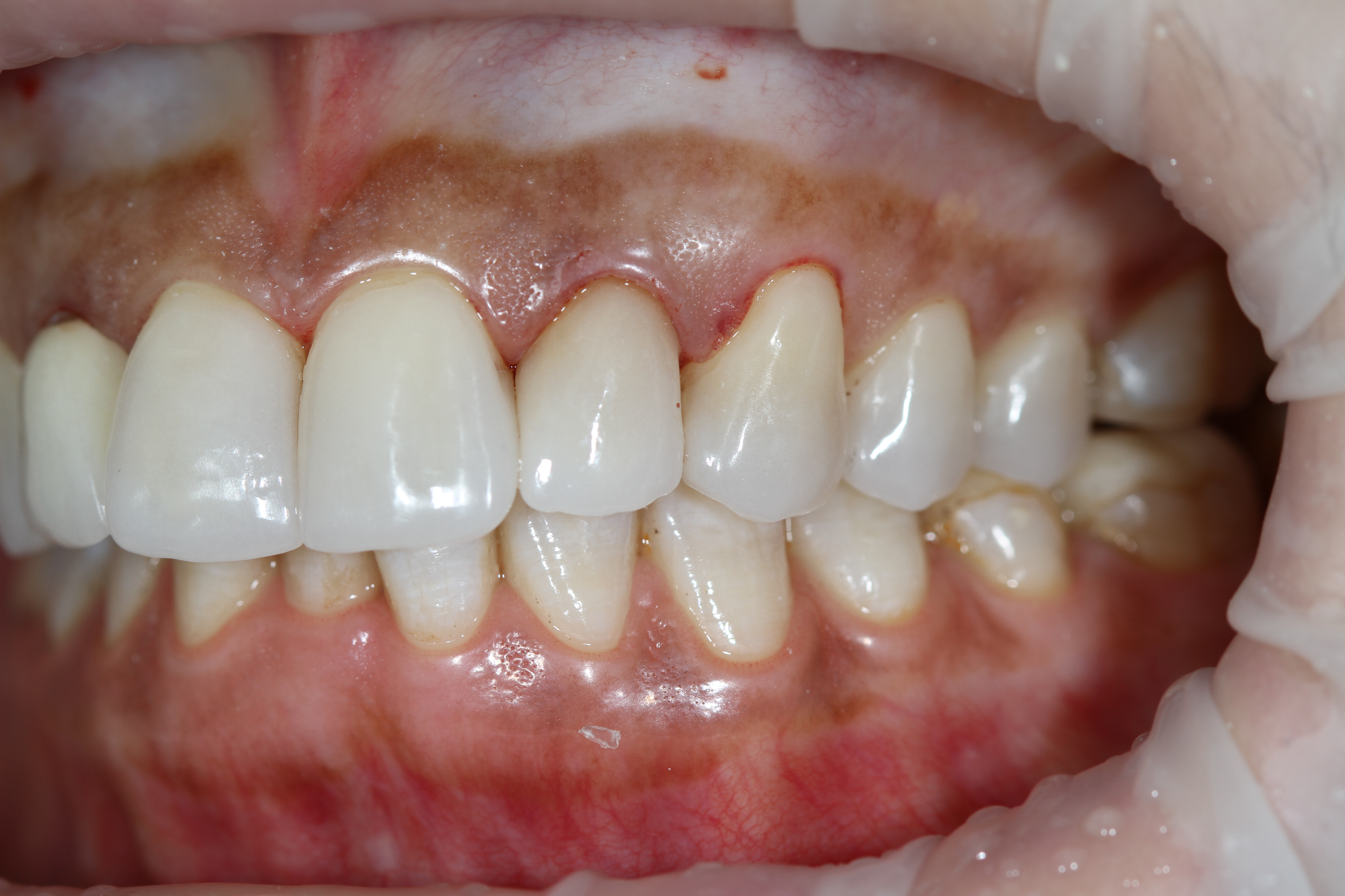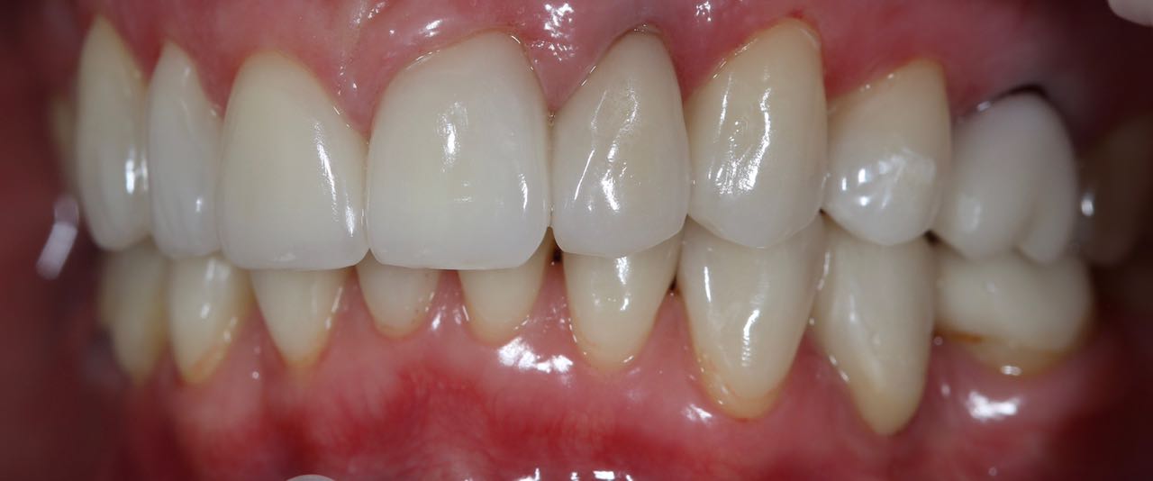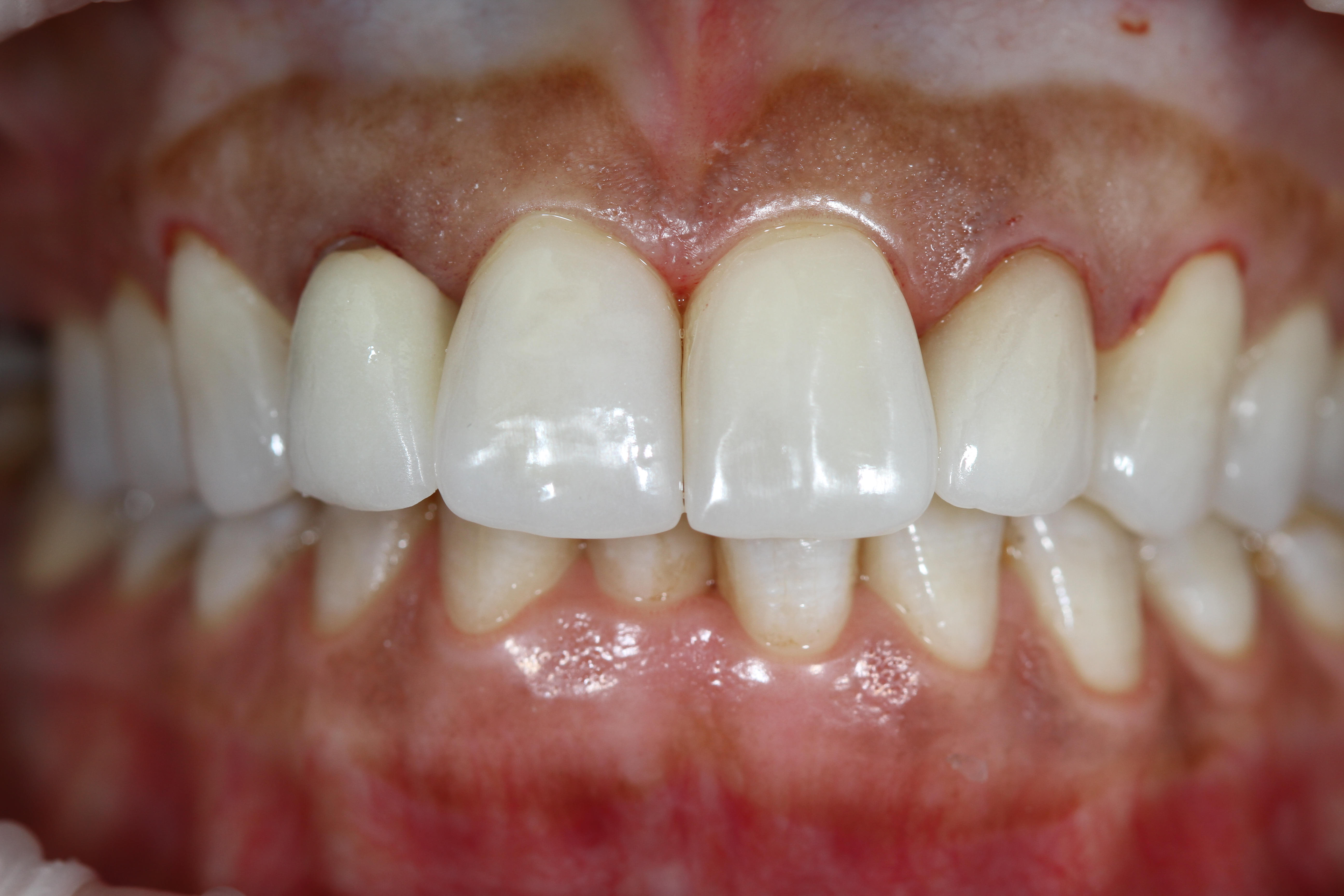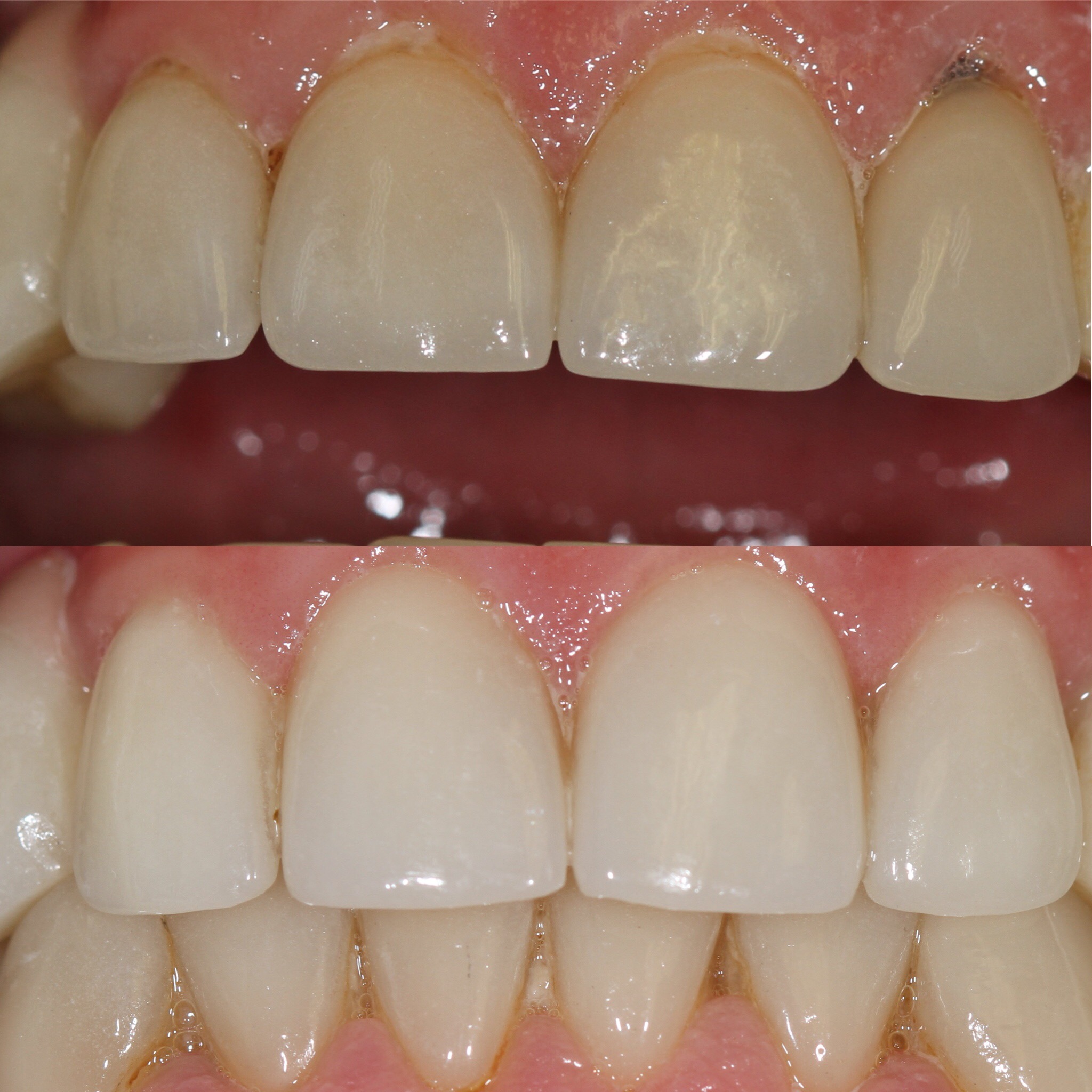 Замена старых виниров темного цвета на более светлые по причине оголения шейки зуба.
