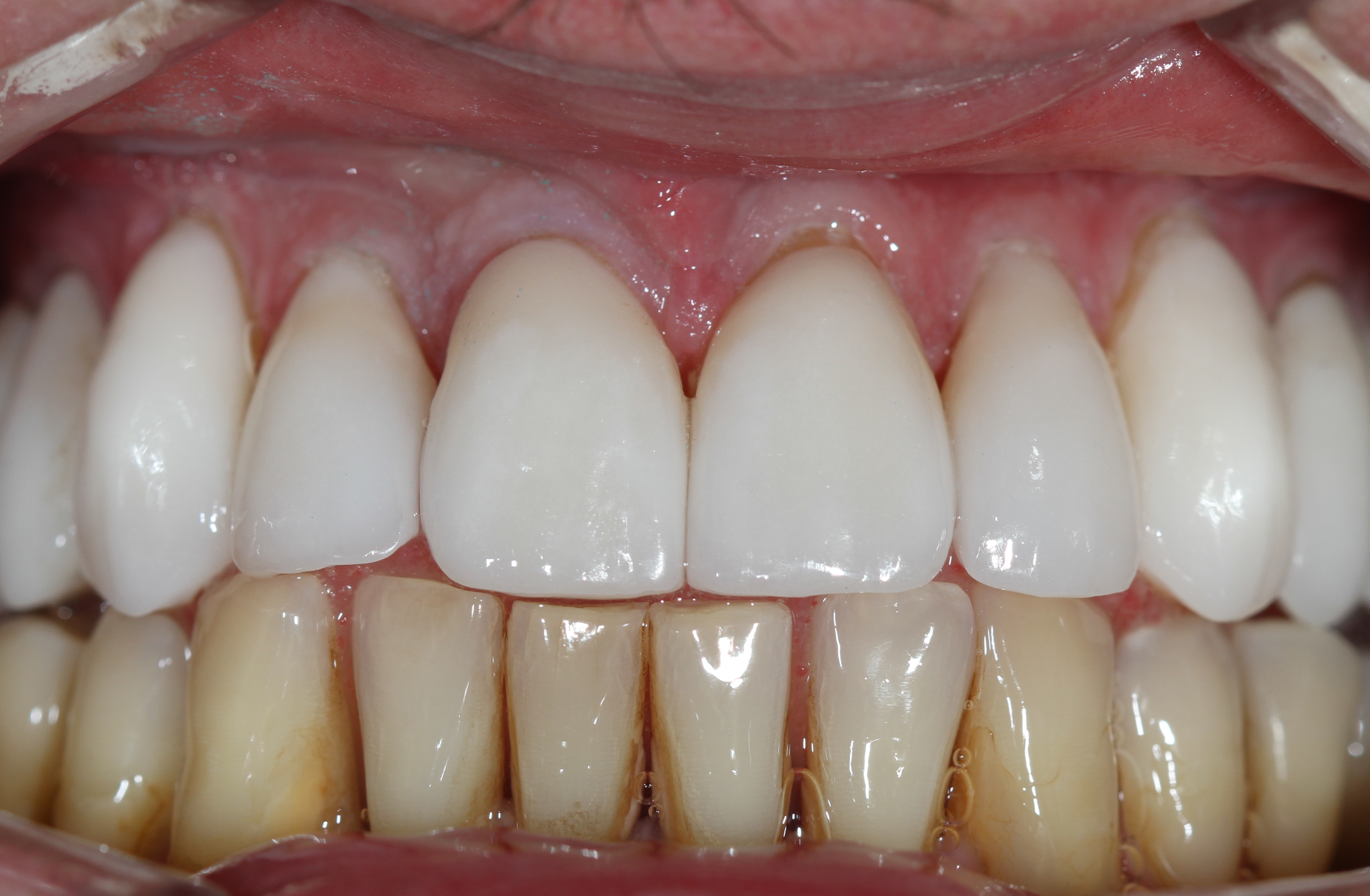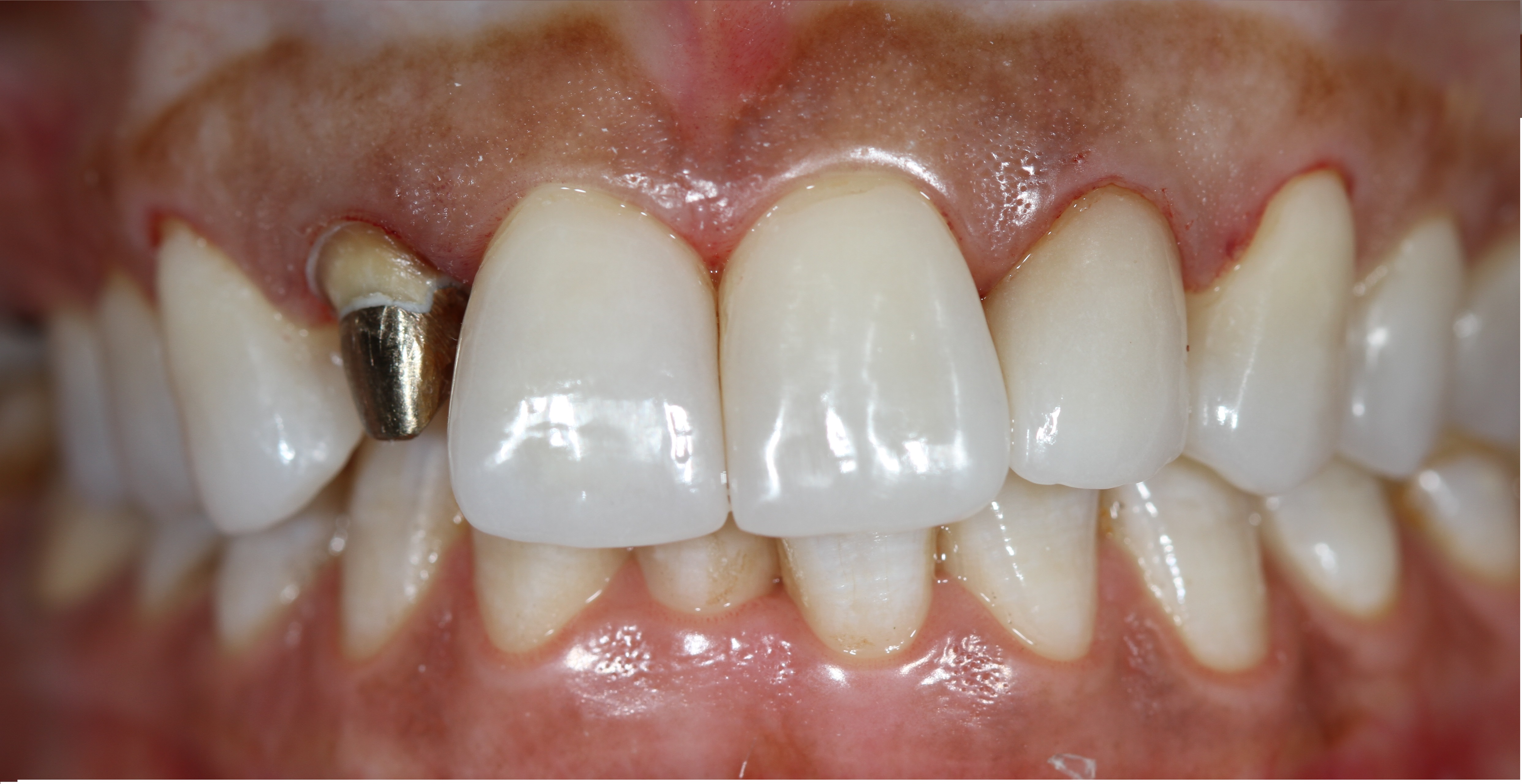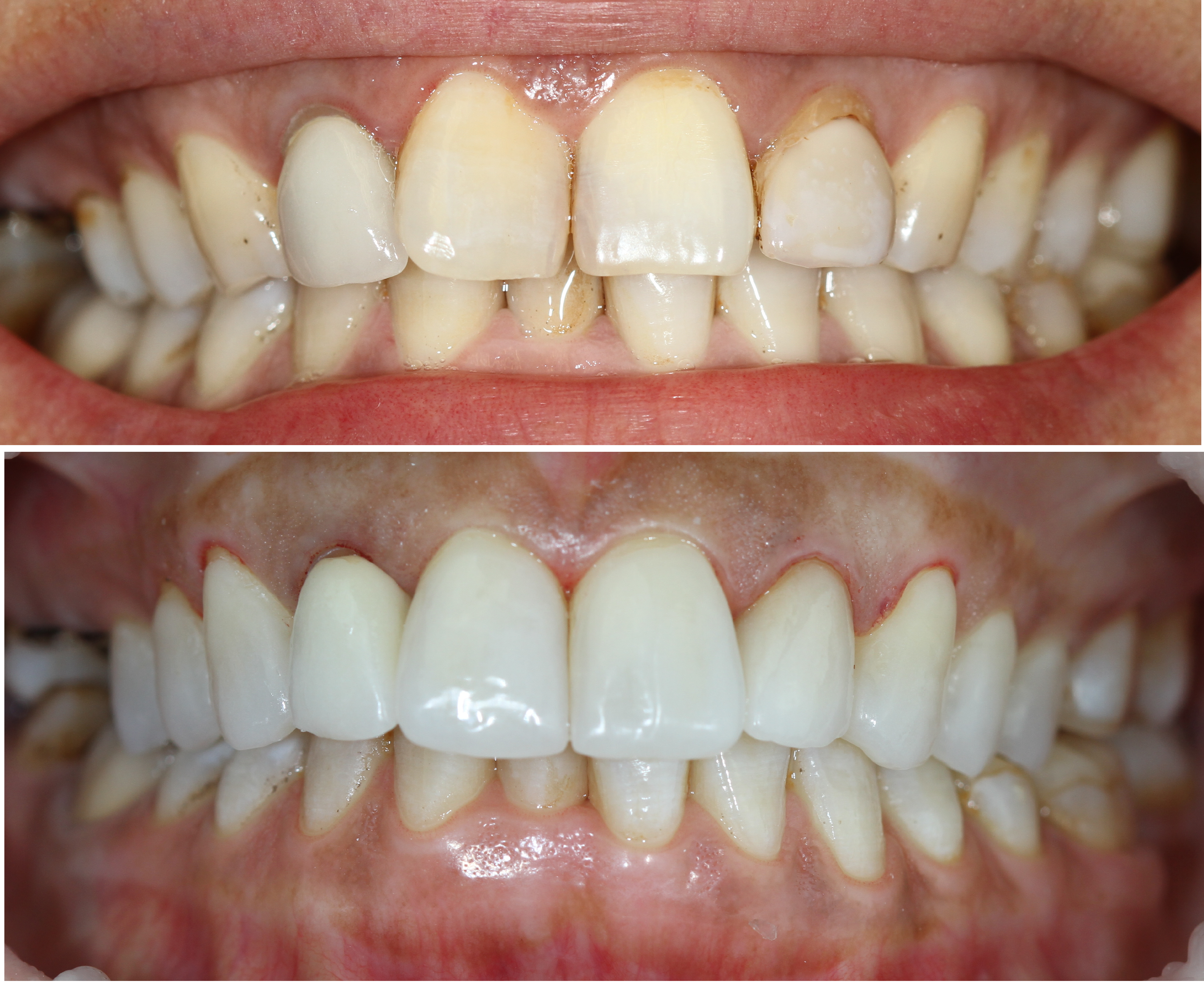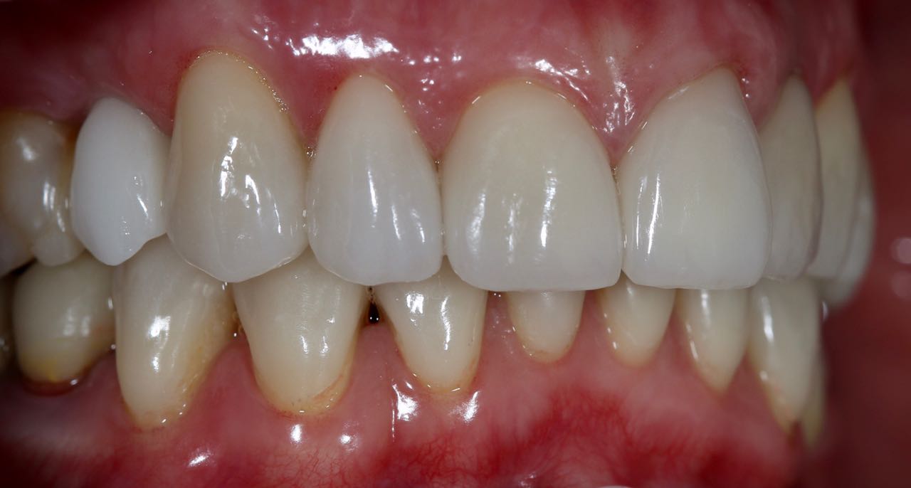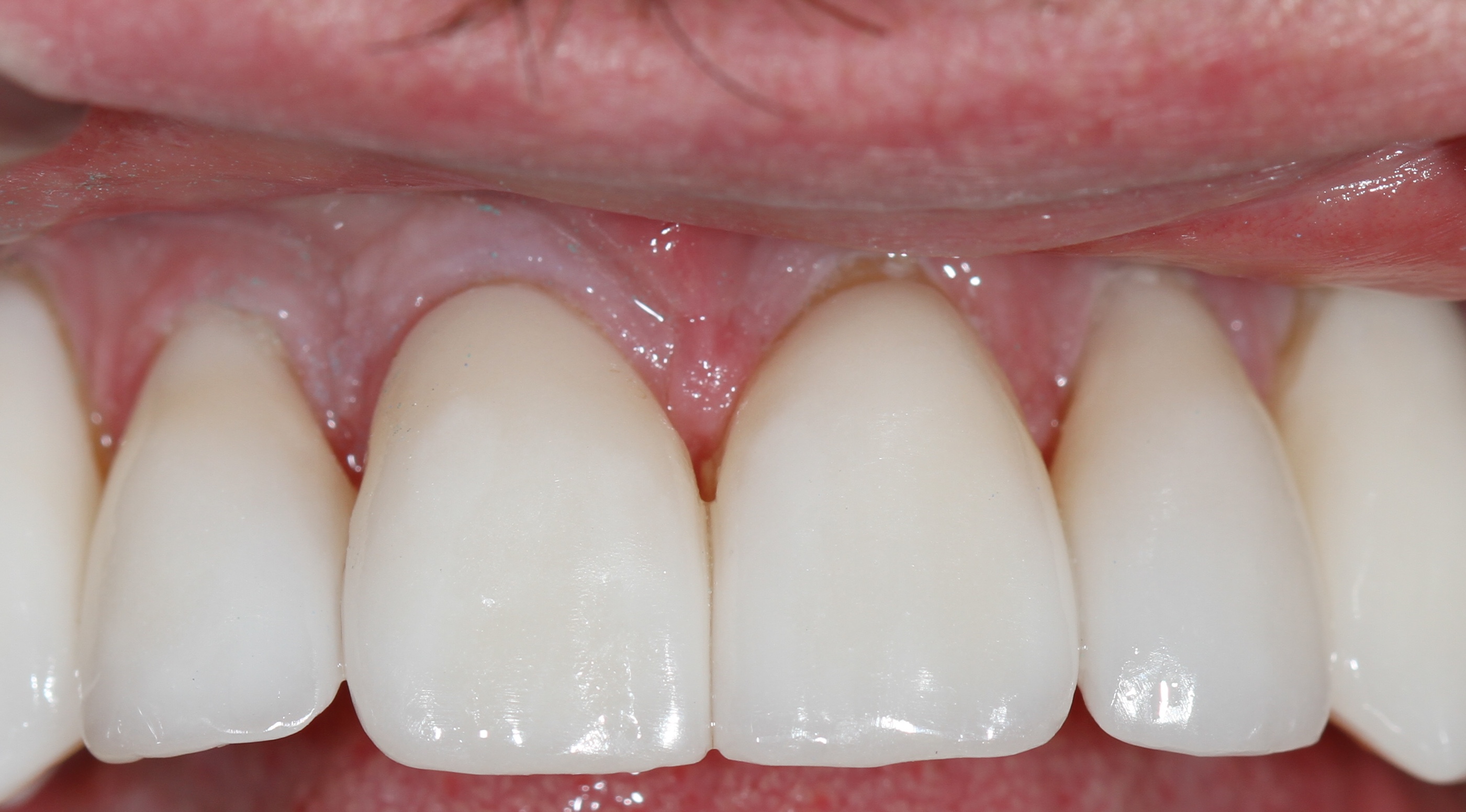 Замена старых виниров темного цвета на более светлые по причине оголения шейки зуба.