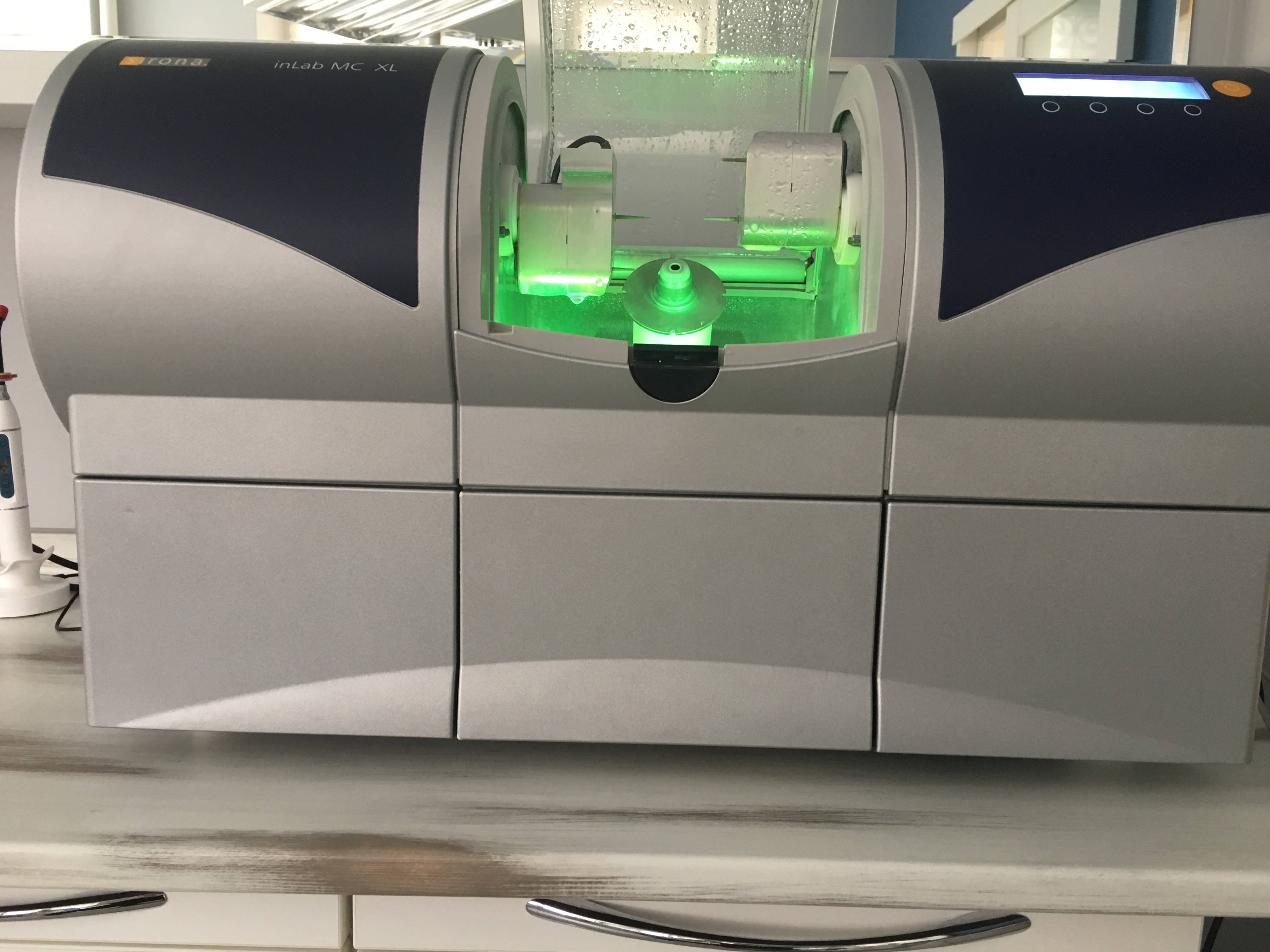 Это наш помошник. На нем фрезеруются каркасы для коронок и мостов. Материалы применяются разные : металл, керамика, оксид циркония, пластмасса. За 10 минут вытачивается готовая реставрация из керамики , за 15 минут готов каркас для мостовидного протеза.