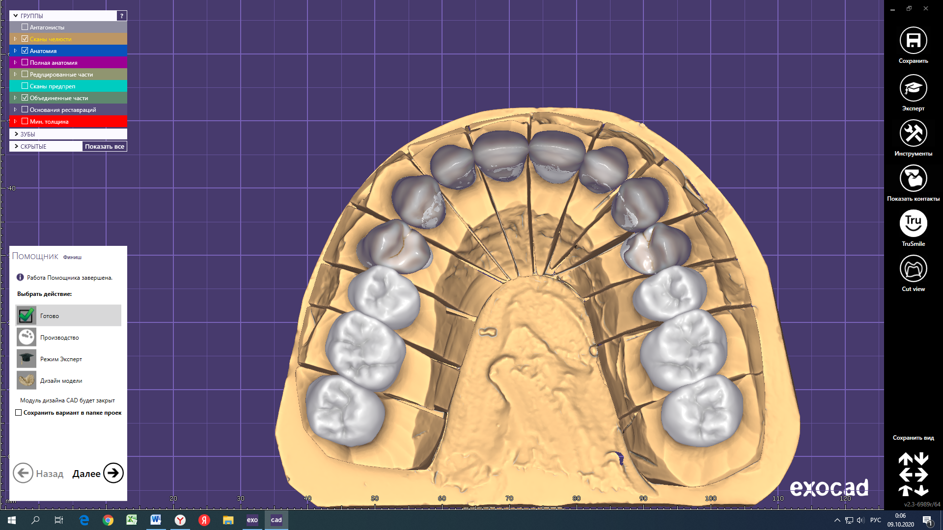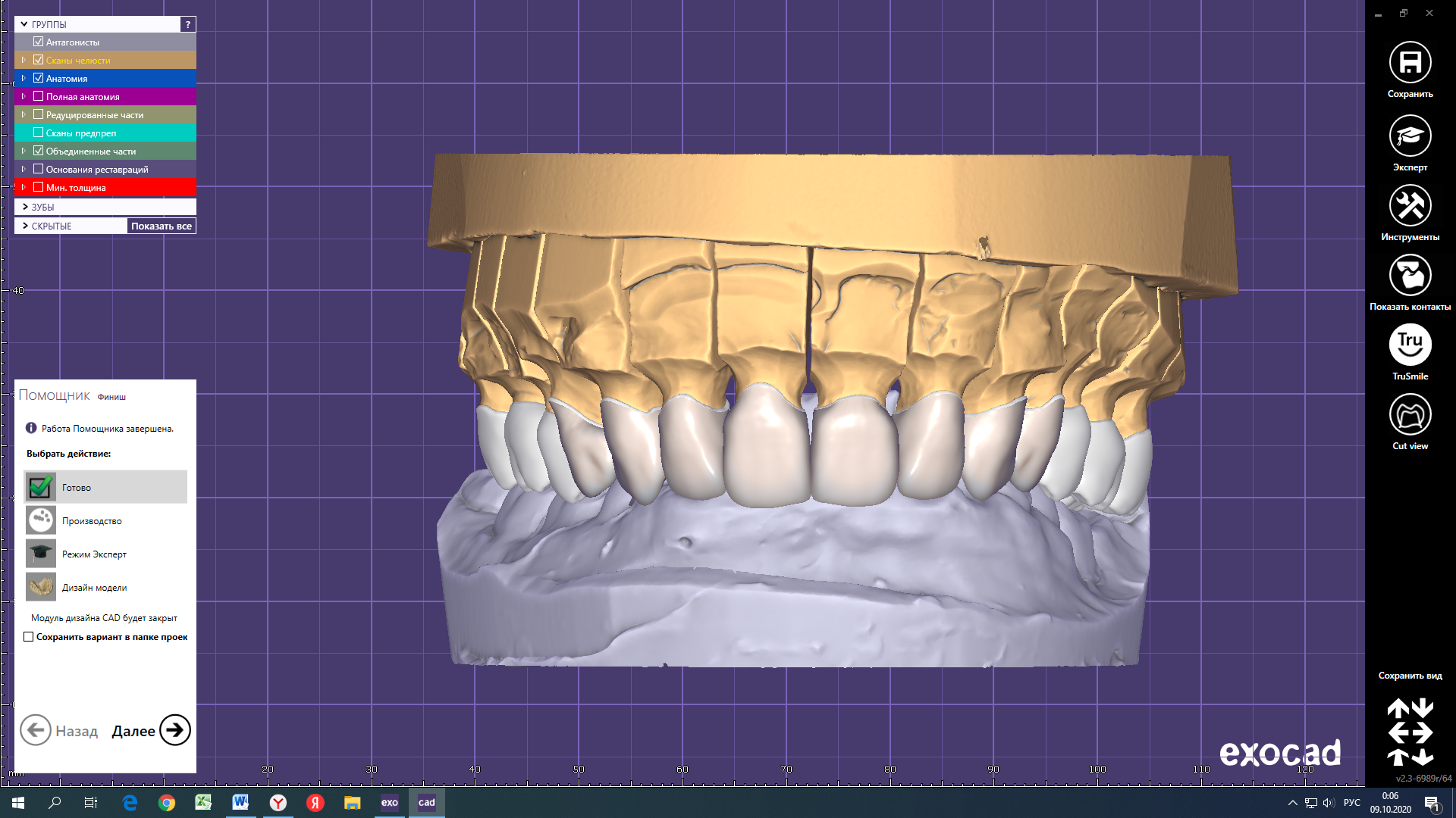 В программе EXOCAD смоделирована работа на верхней челюсти. Фронтальные зубы редуцированы. И нанесена керамическая масса вручную.